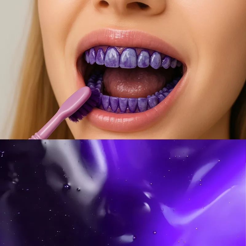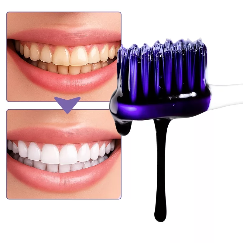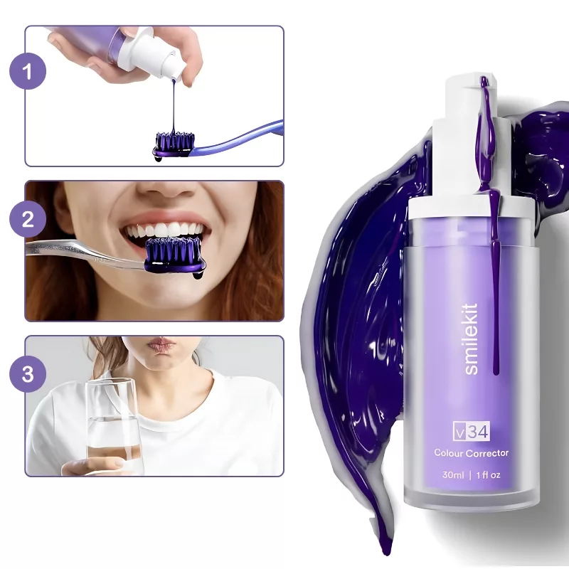 Erzielen Sie ein merklich weißeres Lächeln nach nur wenigen Anwendungen unserer violetten Zahnpasta. Sie hilft, gelbe Untertöne zu neutralisieren, ohne aggressive Chemikalien. Sie ist sicher für den Zahnschmelz und somit für den täglichen Gebrauch geeignet.